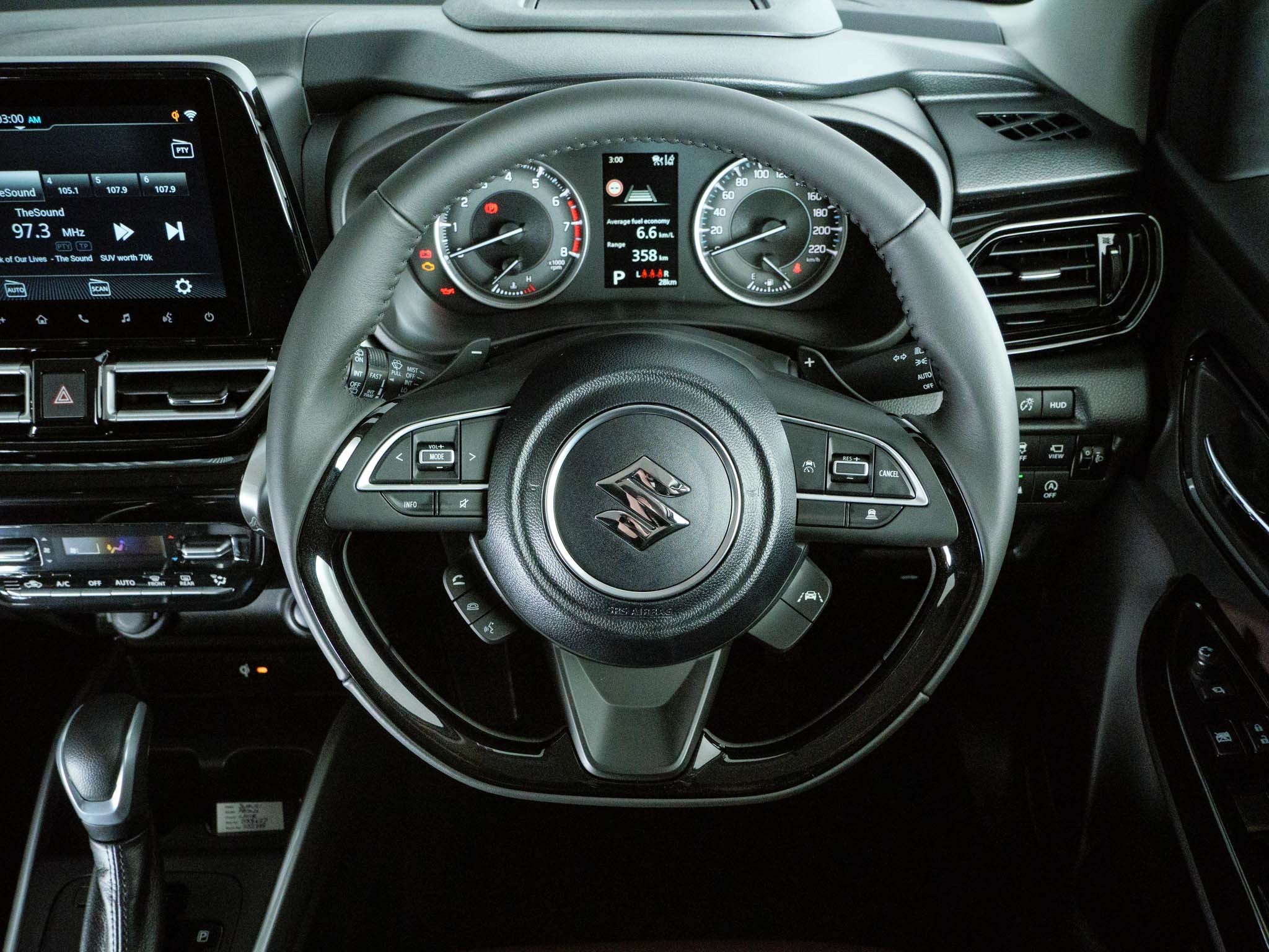 ENGINE & TRANSMISSION 1.5 litre, 12 valve, VVT 4-cylinder, MPI fuel injection 12V Hybrid ISG (Integrated Starter Generator) Engine auto stop-start system 75.8 kW @ 6,000 rpm 136.8 Nm @ 4,400 rpm 6-stage automatic with paddle shifters Sport driving mode FUEL 4.9 L/100km fuel consumption NEDC (5.4 L/100km 3P-WLTP conversion) 113 g/km CO2 emissions NEDC (125 g/km 3P-WLTP conversion) 91 RON with 37 L fuel tank capacity INTERIOR Keyless entry and push-button start Climate control air conditioning Tilt and telescopic adjustable steering wheel Leather steering wheel with cruise, lane keep assist, phone, info display and audio controls Electric parking brake with hold function Heads-up display Touchscreen infotainment - Six speaker Tuner/MP3/WMA - Bluetooth and USB input - Wireless Android Auto and Apple CarPlay - Smartphone connected navigation Wireless Qi charging pad Rear USB-A and USB-C charging ports Fuel display (instant, average and range) Two-tone fabric and leather effect seat upholstery Dual control heated front seats Drivers side seat height adjuster Adjustable armrest with console box EXTERIOR 16-inch polished alloys with 195/60R16 tyres Privacy glass (rear passenger and hatch) Electrically folding heated side mirrors Automatic light sensing LED headlamps Rear LED combination lamps LED daytime running lamps (DRLs) Guide Me light Front and rear under garnishes Wheel arch extensions Chrome beltline garnishes Shark-fin style aerial SAFETY 360 view camera Reverse camera Parking proximity sensors (4 front, 4 rear) Dual Sensor Brake Support II Traffic sign recognition Lane keep assist Lane departure warning and prevention Adaptive cruise control with stop & go Weaving alert Headlamp high beam assist Blind spot monitor Rear cross traffic alert Hill hold control ESP, ABS, EBD and brake assist 6 SRS airbags (front, side and curtain) Seatbelt reminder all seats Child seat tether and ISOFIX anchorages Security alarm