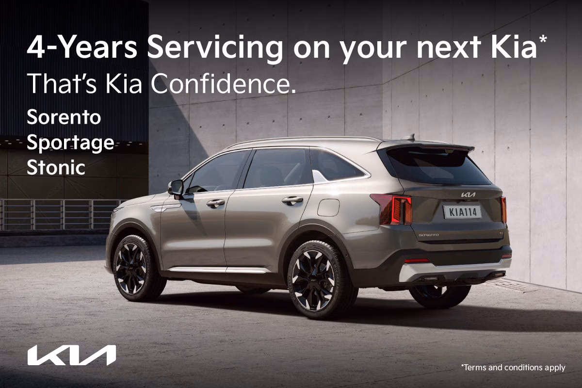 For a limited time, when you buy a brand-new Kia Sorento, Sportage or Stonic, we’ll throw in four years of free servicing – up to 40,000km. That means no servicing costs for the first four years, over $1,000 in savings.