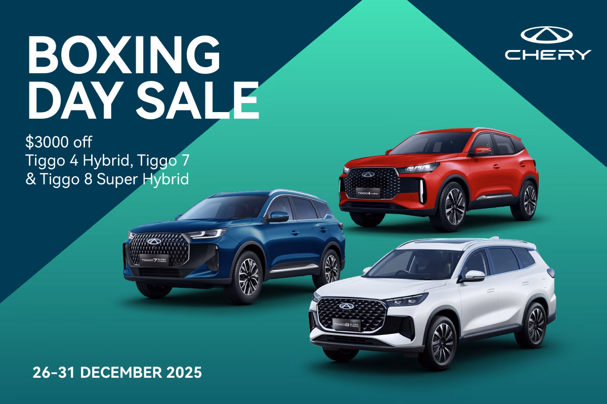 *Boxing Day Sale offers available on eligible new Chery Tiggo 4 Hybrid, Tiggo 7 Super Hybrid and Tiggo 8 Super Hybrid vehicles purchased between 26/12/2025 and 31/12/2025 and delivered by 31/12/25. While stocks last. Offers not redeemable for cash or available to fleet, government or rental buyers. Not available in conjunction with any other offers. Chery Motor New Zealand reserves the right to extend, modify or withdraw this offer in its sole discretion.