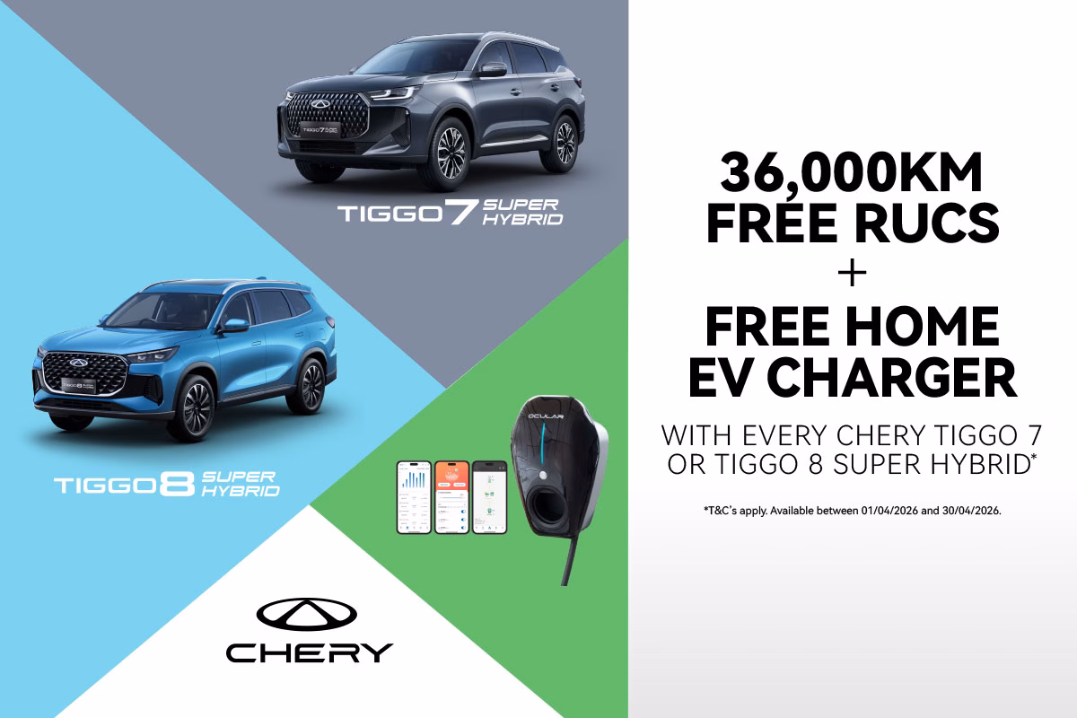 *Offer available on eligible new Chery Tiggo 7 Super Hybrid and Tiggo 8 Super Hybrid vehicles purchased between 01/04/2026 and 30/04/2026 and delivered by 31/05/26. Includes 36,000 kilometres of Road User Charges applicable to Plug-in Hybrid vehicles. ‘Free EV Charger’ is an Ocular IQ Home Single Phase 7kW unit with a 5 metre Type 2 cable only, and does not include installation. Offer is not redeemable for cash or available to fleet, government or rental buyers. Not available in conjunction with any other offers. While stocks last. Chery Motor New Zealand reserves the right to substitute the brand and model of EV charger supplied with an equivalent 7kW home charger, at its sole discretion. Chery Motor New Zealand reserves the right to extend, modify or withdraw this offer at its sole discretion.