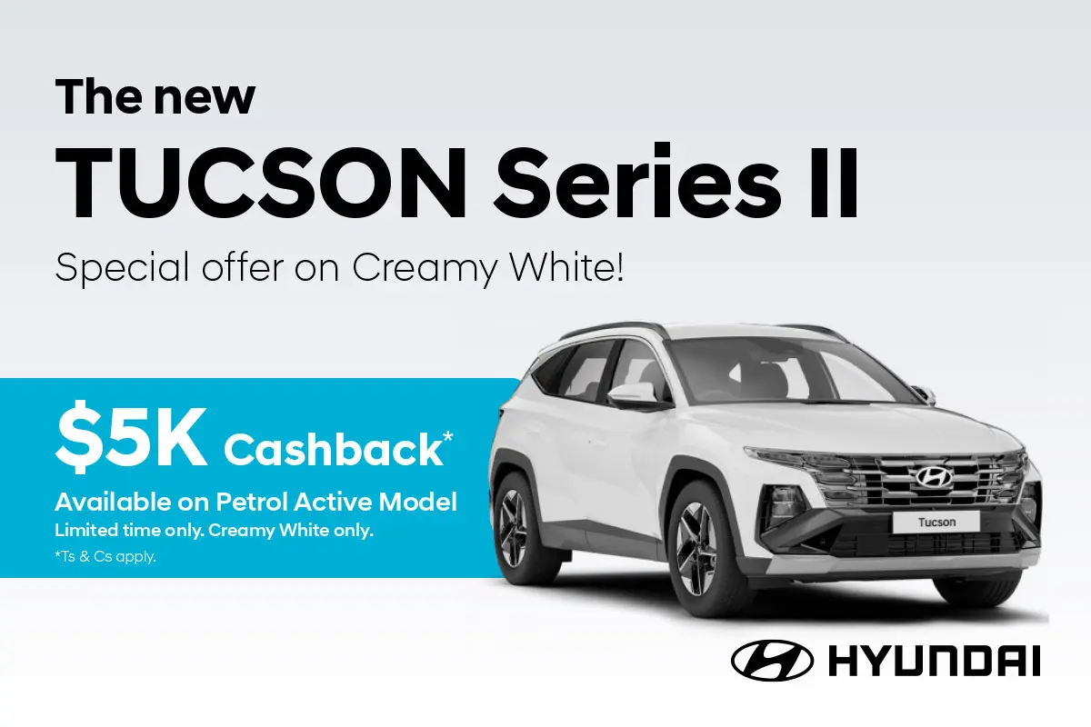 Receive a $5,000 cashback when you purchase a Creamy White Pearl Hyundai TUCSON Active 2.0 petrol model. Offer applies to new purchases only and excludes fleet, government and rental buyers. Offer available until 30 September 2025. Cashback will be provided as a direct discount off the purchase price. Not available in conjunction with any other offer