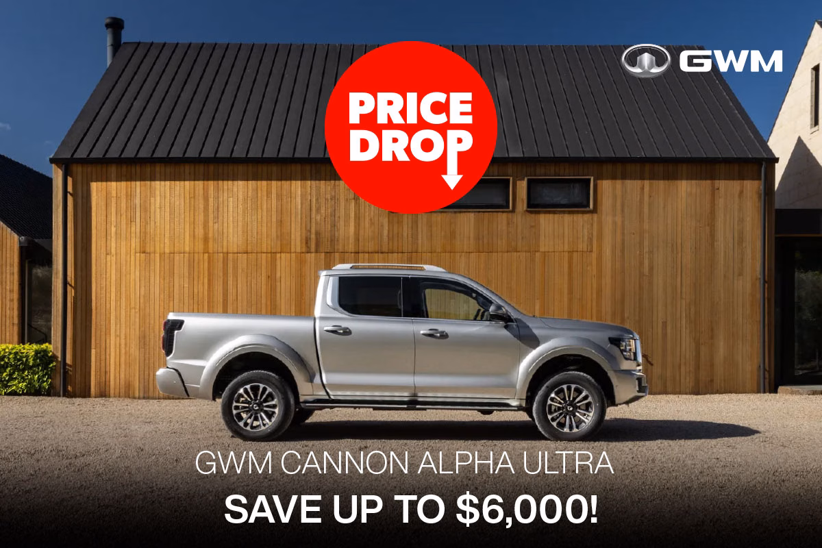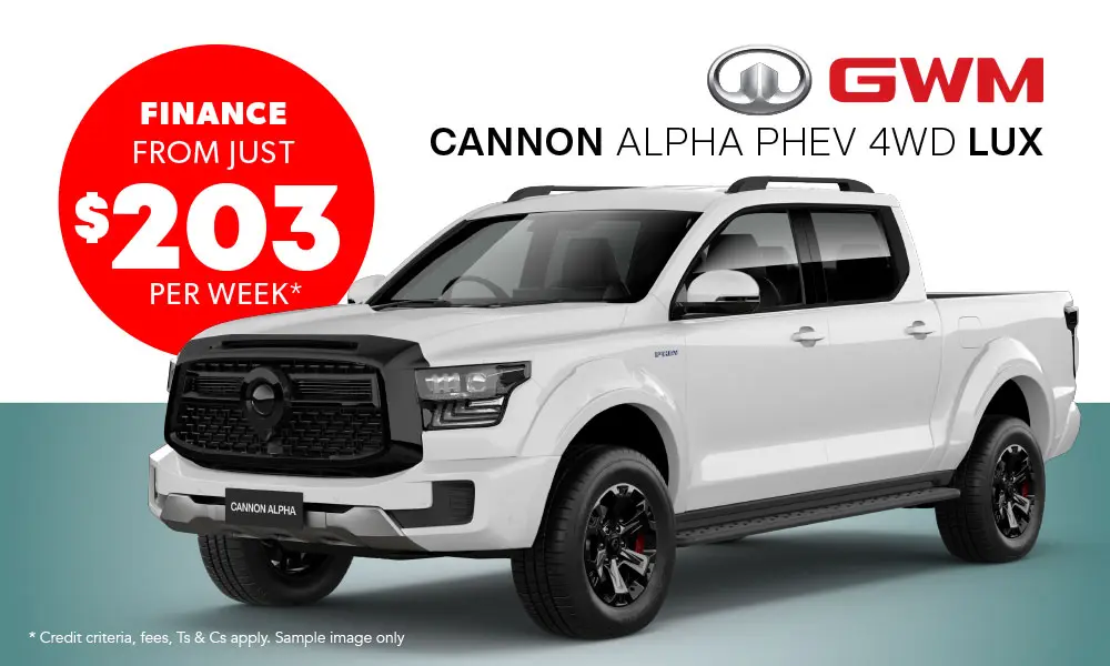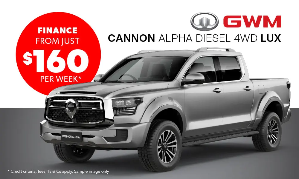 The from $159.97 per week repayments are based on the new GWM Cannon Alpha Lux model with an RRP of $54,990, a $8,248.5 deposit (15% of RRP), 4.95% p.a. interest rate fixed for the 60-month term of the loan, and a $13,747.50 residual payment at the end of the loan term. The total cost of repayments is $53,274.70. On-road costs, a $130 UDC establishment fee, $10.35 PPSR fee, weekly maintenance fee of $0.50, and a dealer origination fee of $455 will apply. Offer available from 1 October to 31 December 2025. Offer cannot be used in conjunction with special price offer. Finance is provided through UDC Finance Limited. UDC’s lending criteria, standard terms and conditions apply.
